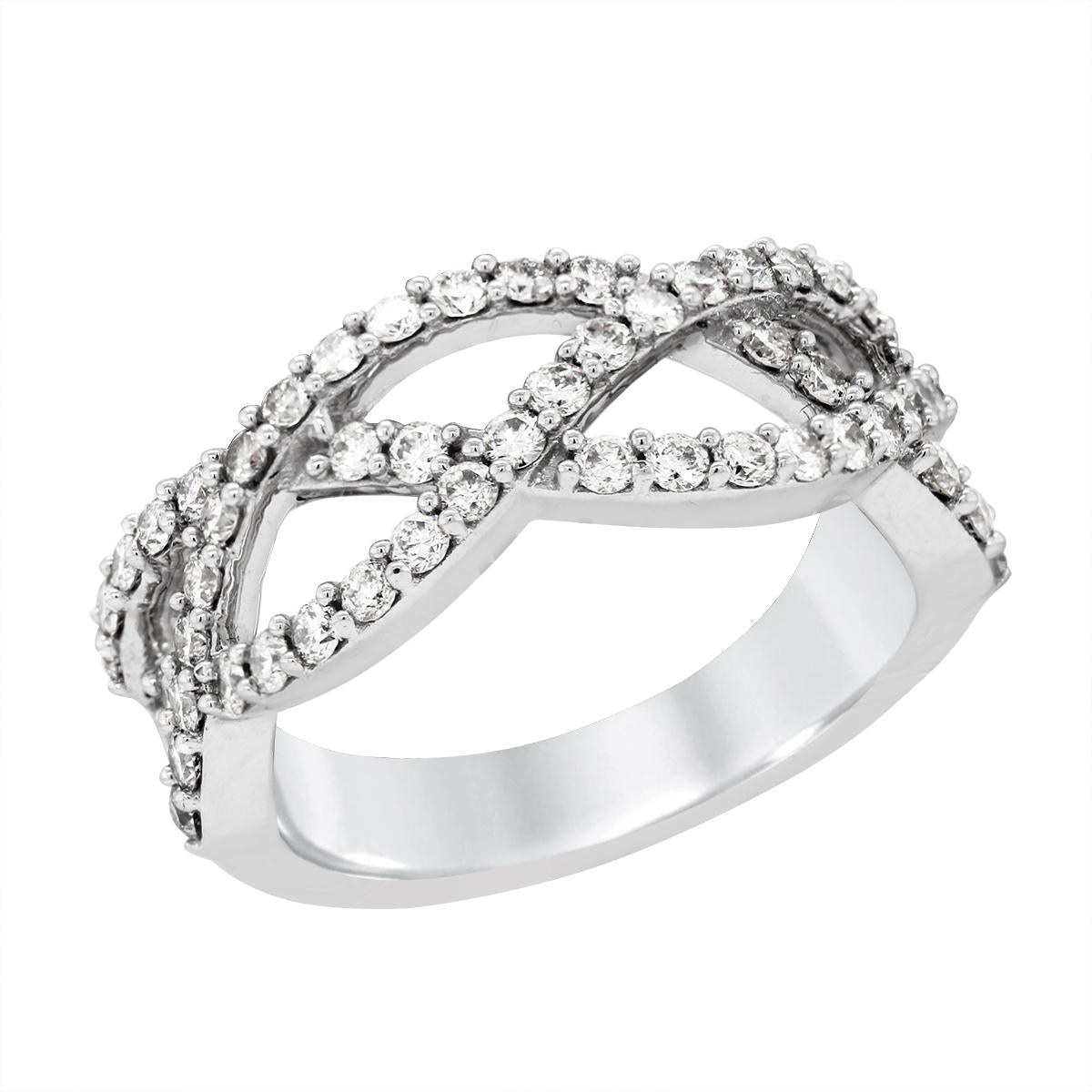 Crafted in 14k white gold, this infinity style ring is set with 53 round cut diamonds weighing 1.00 ct tw. Currently available in size 7, ask us about other sizes.