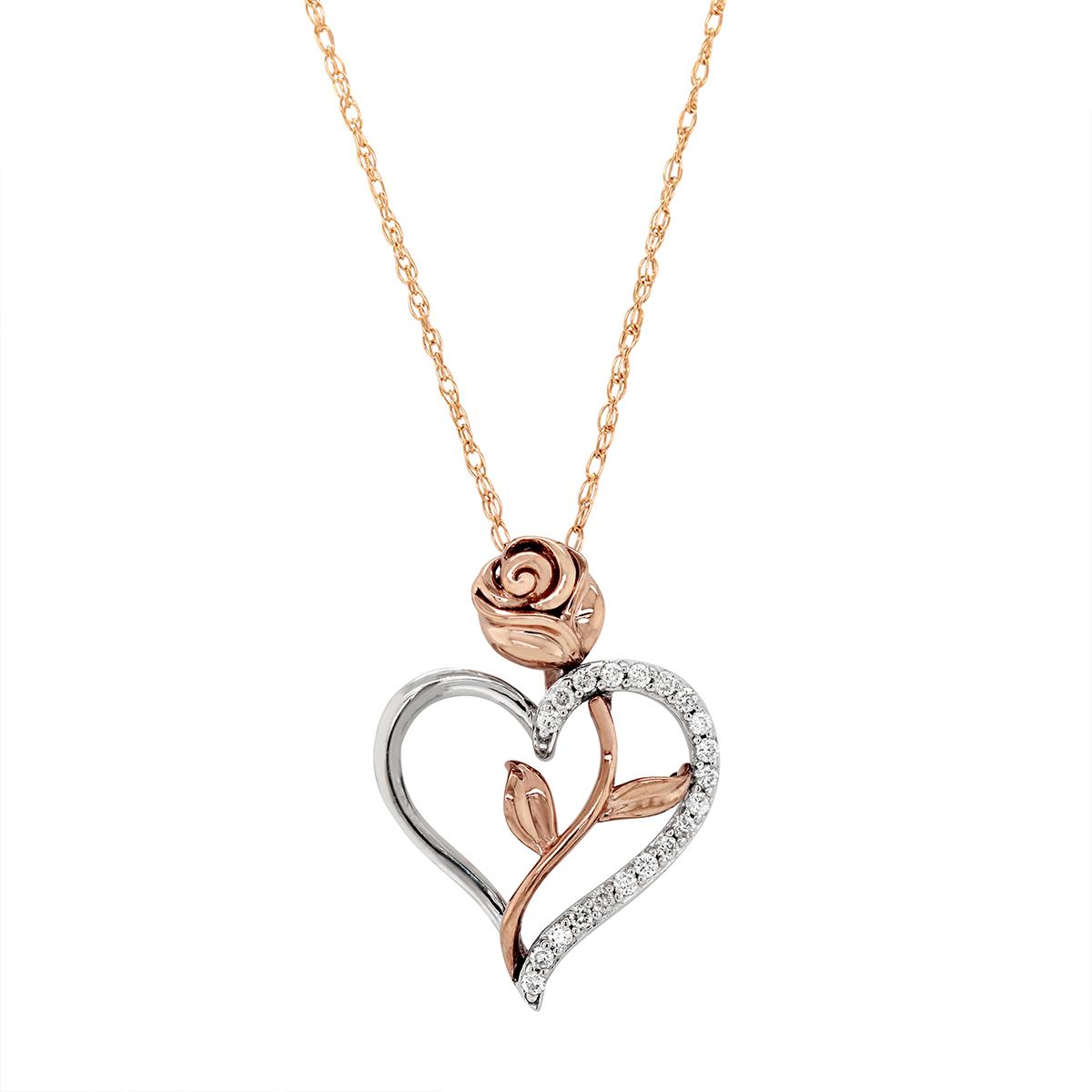 Crafted with sterling silver and 10k rose gold, this rose and heart pendant is set with 20 round cut diamonds, 1/4 ct tw. The chain measures 16 inches in length. Howard's Certified Like New.