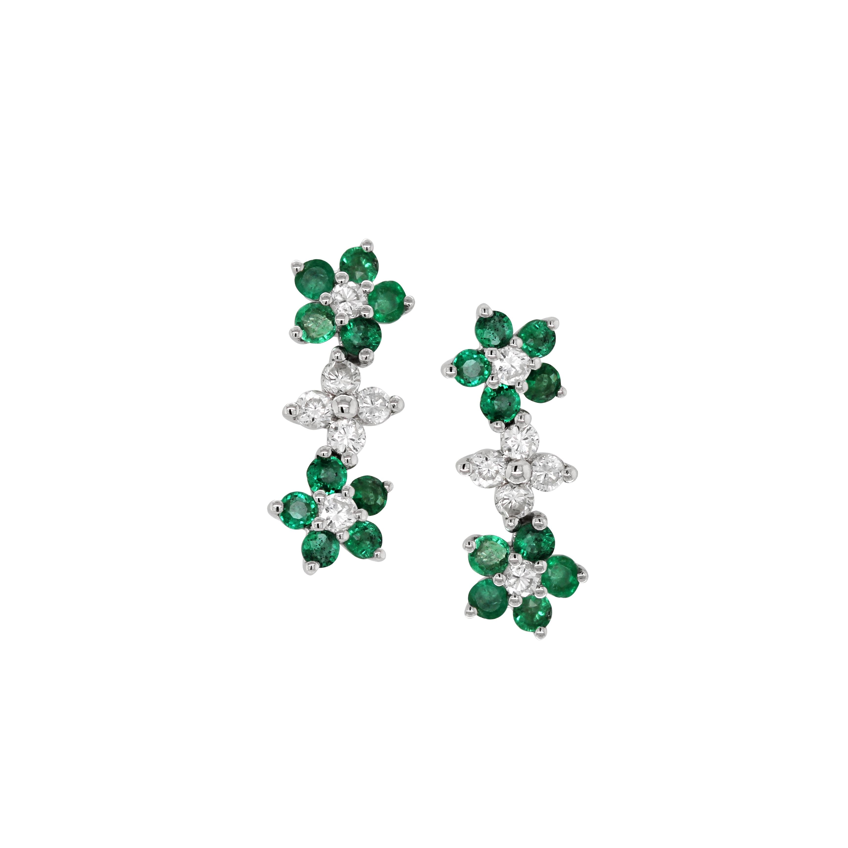 Crafted in 14k white gold, these floral style dangle earrings are set with 20 round emeralds and 12 round cut diamonds, .18 ct tw.